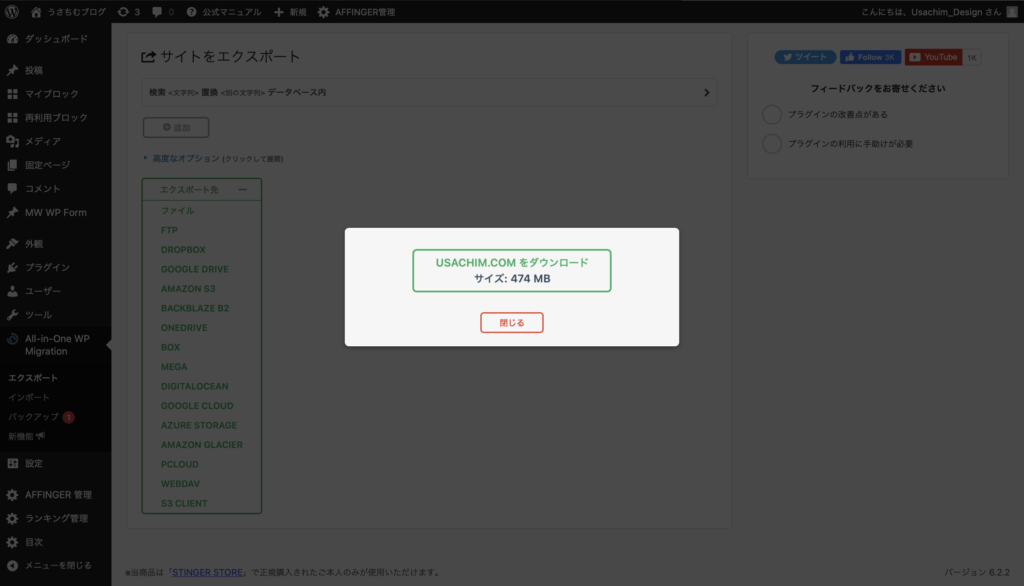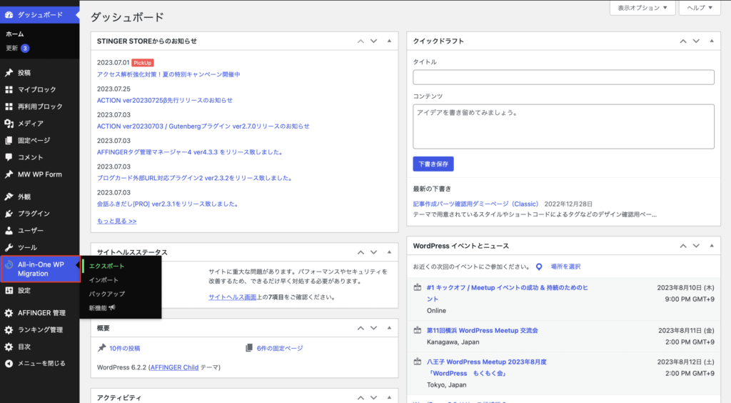 既存サイトに【All-in-One WP Migration】のプラグインを追加し、サイトをエクスポート