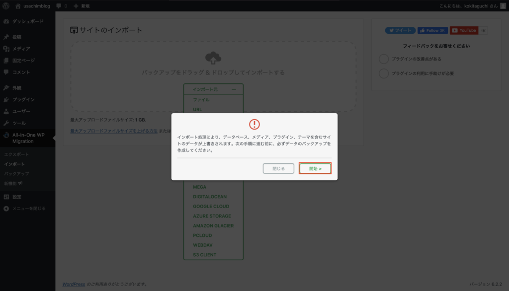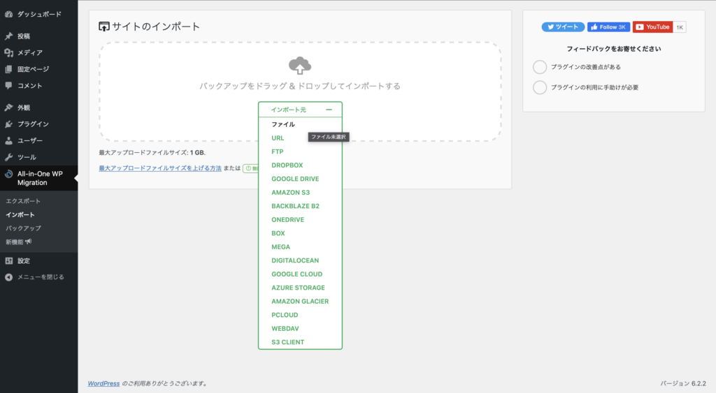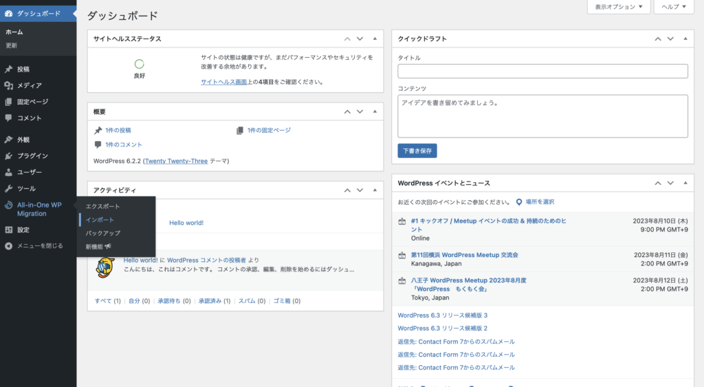 有効化した状態で、管理メニューのAll-in-One WP Migration⇨インポートを選択します。