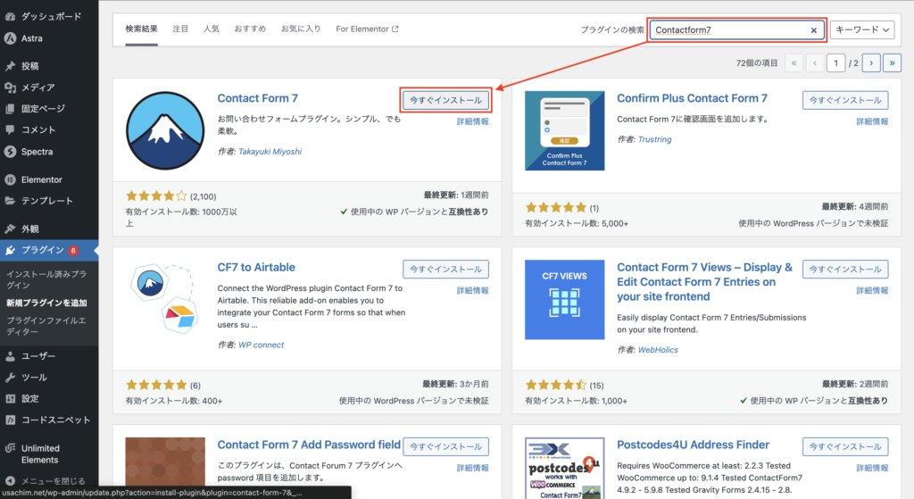 検索バーに「Contact Form 7」と入力し、表示されるプラグインをインストールします。