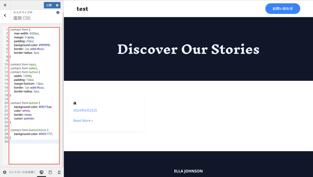 次に、CSSコード追加します。追加する場所は、スタイルシートもしくは、カスタマイズ > 追加CSSに貼り付けましょう。このデザインは一般的なものなので、コードを変更することで自由にカスタマイズできます!