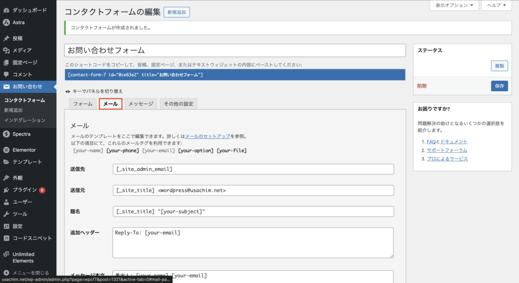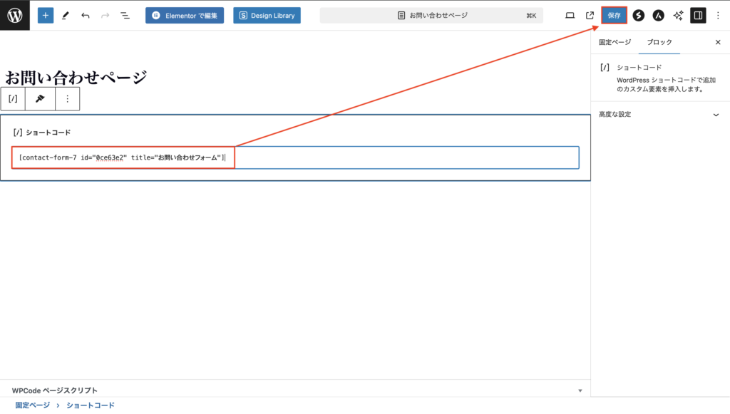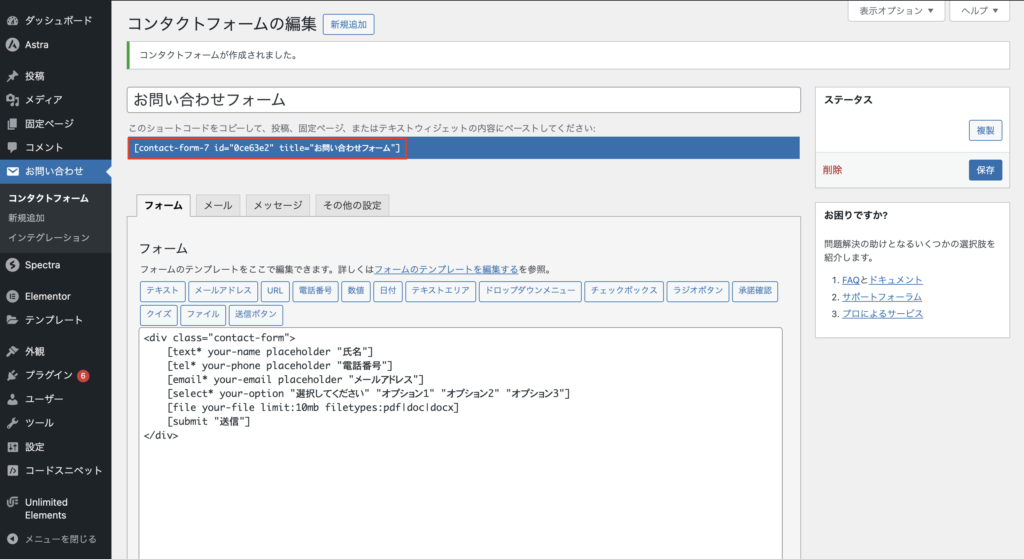 ショートコードは、フォームを保存したときに表示される下記のコードになります!
