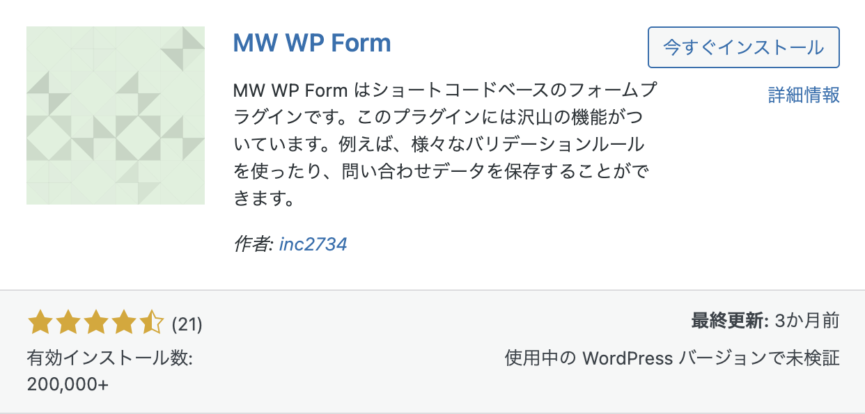 まずはプラグインの導入から始めます。以下の方法でMW WP Formをインストールし、有効化してください。