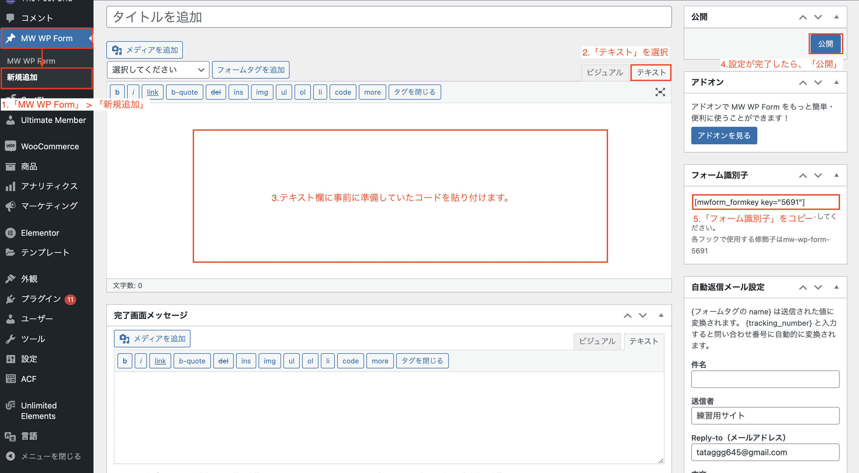 1. 左側のメニューから「MW WP Form」 > 「新規追加」を選択します。